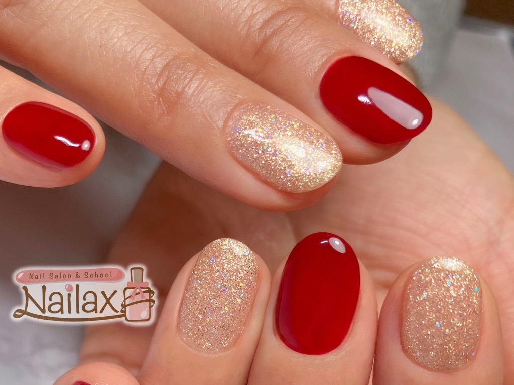王道のレッドネイルにラメで、