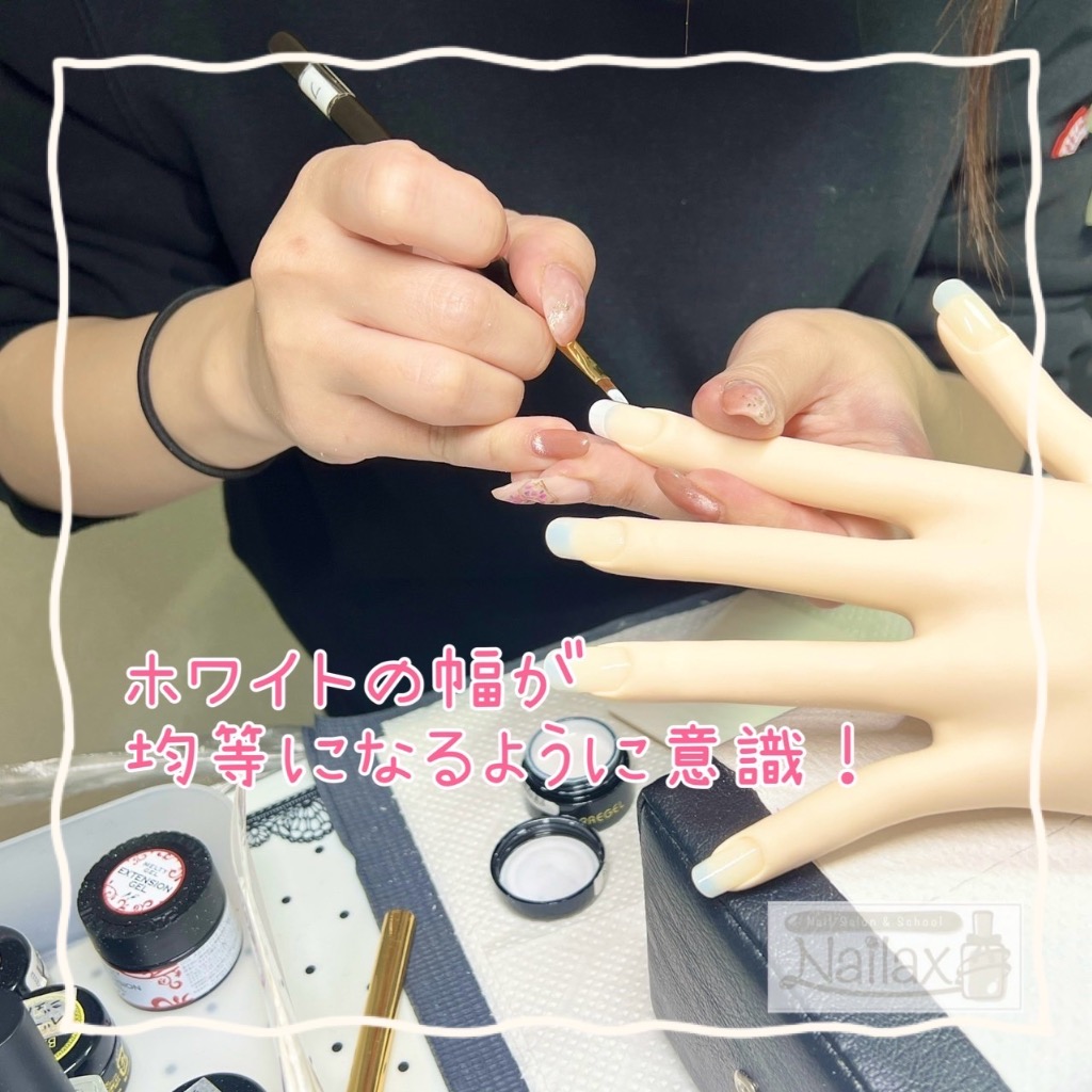 フレンチネイルは、全ての爪に均等な幅のホワイトを乗せ、パキッと美しいスマイルラインを作るのが中々大変ですよね🥲更に検定は時間との戦い⏰💦