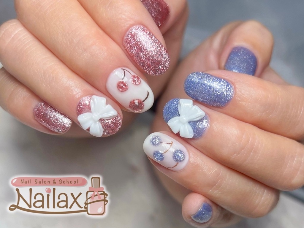 本日のお客様ネイルは、リボン🎀とさくらんぼのネイルです💅🍒