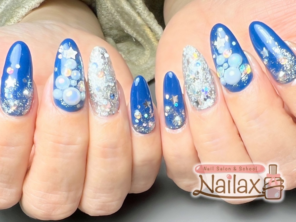 推しのカラーが青とのことで、ブルー✖️シルバーでクリスマスネイルをしたいと持ち込みオーダー🎄