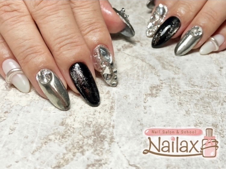 クロムのミラーにストーン埋め尽くしでかなり存在感のあるギラギラネイルです🖤
