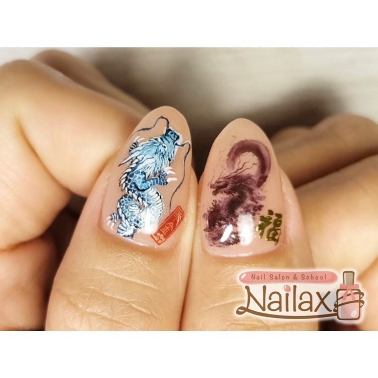 今回のご紹介は、先日ご来店くださいましたお客様のリクエストで、手描きの青龍とステッカーのコラボレーションネイル🐉✨️
