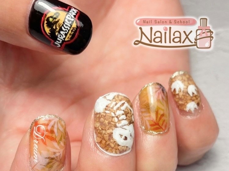 コルクネイルにジュラシック・パークの手描きアートを施して誰とも被らないこだわりネイルアートが完成しました。