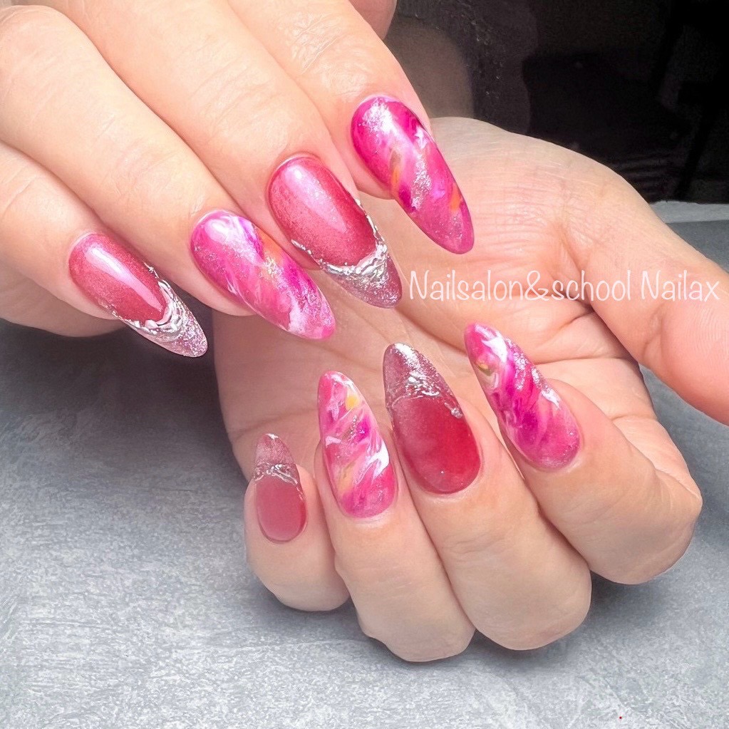 ピンクを基調としたマーブル模様が指先を明るく見せ、