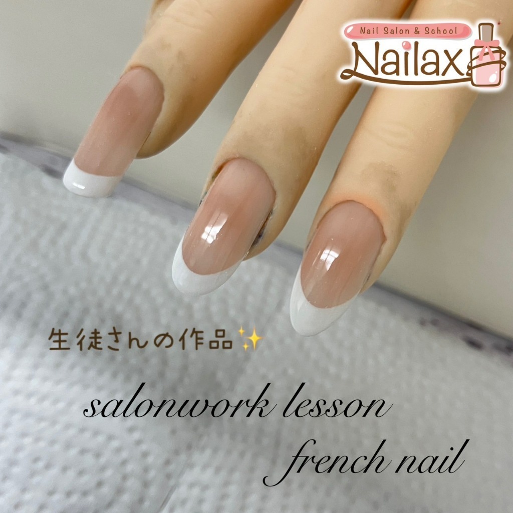 ご紹介しているお写真の生徒さんは、お爪の形に合わせて綺麗に見えるフレンチラインを学びたい、とご相談をいただき個別レッスンをさせていただきました。