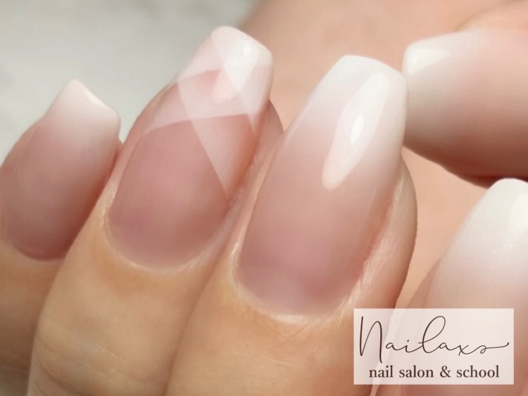 繊細なグラデーションをジェルを吹きつけ描き、変形フレンチが重なったような仕上がりのお写真をご紹介します。